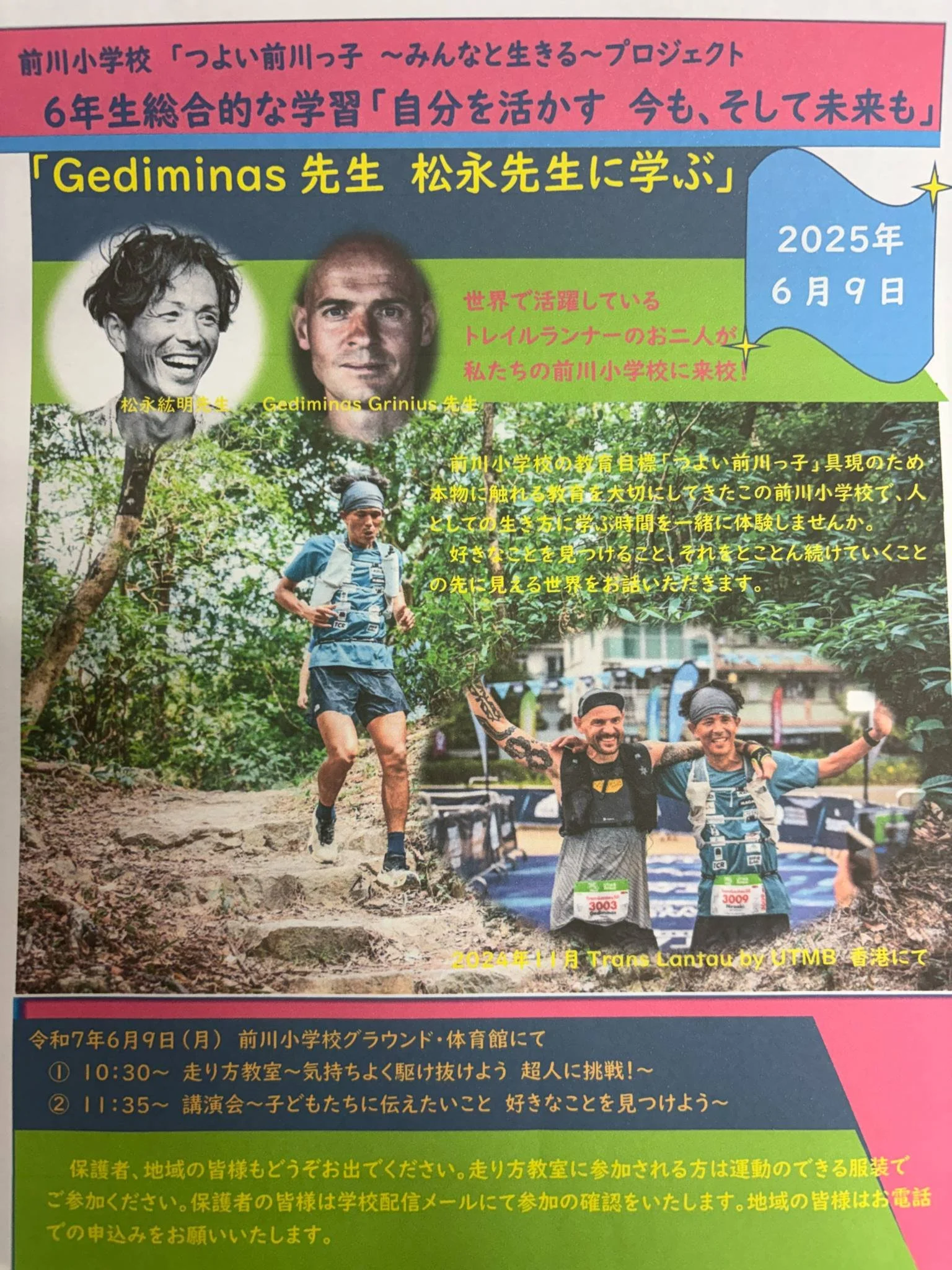 2025/06/09(月)DEEP JAPAN ULTRA 100の開催地、新潟県長岡市立前川小学校にて【夢授業】を開催します。「夢授業」はトレイルランナーズのSDGs事業「全国山間地域未来づくりプロジェクト」の一環として、自分の好きなことを追い求めることの大切さを子どもたちに伝えたいという松永の強い想いから実施しています。長岡市立前川小学校での【夢授業】では、ウルトラトレイル世界王者のGediminas Grinius選手をお招きして、走り方教室や講演を行います。保護者、地域の皆さまもこの機会にぜひご参加ください。